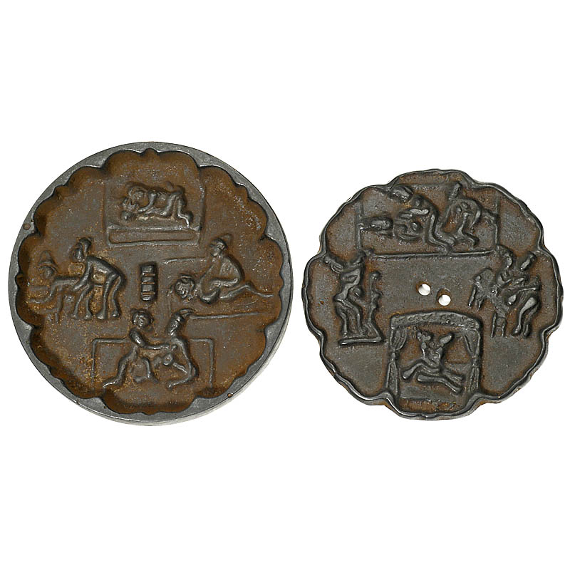 Asian cast-iron moulds, with depictions from the Kama Sutra, possibly used for the production of lithophanes, Ø 3 and 2 ½ in.