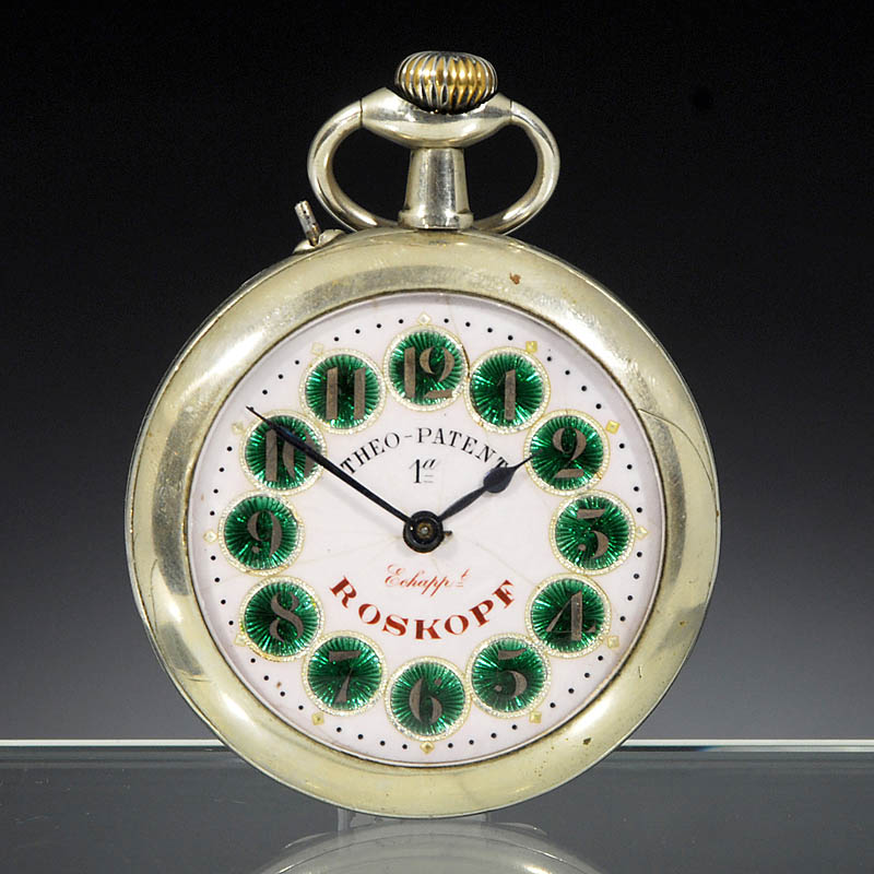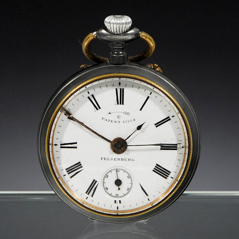 1) Driver's clock "Theo Patent 1A", with Roskopf balance, c. 1910. 2) Swiss alarm clock "Felsenburg", steel case, c. 1880. 3) Brass clock with anchor escapement, c. 1920. 4) Alarm clock "Union", steel case, c. 1900. 5) Watch chain with 9 strands and slide with enameled picture. 6) 4 watch chains. 7) Casket with 15 compartments. – All movements are working.