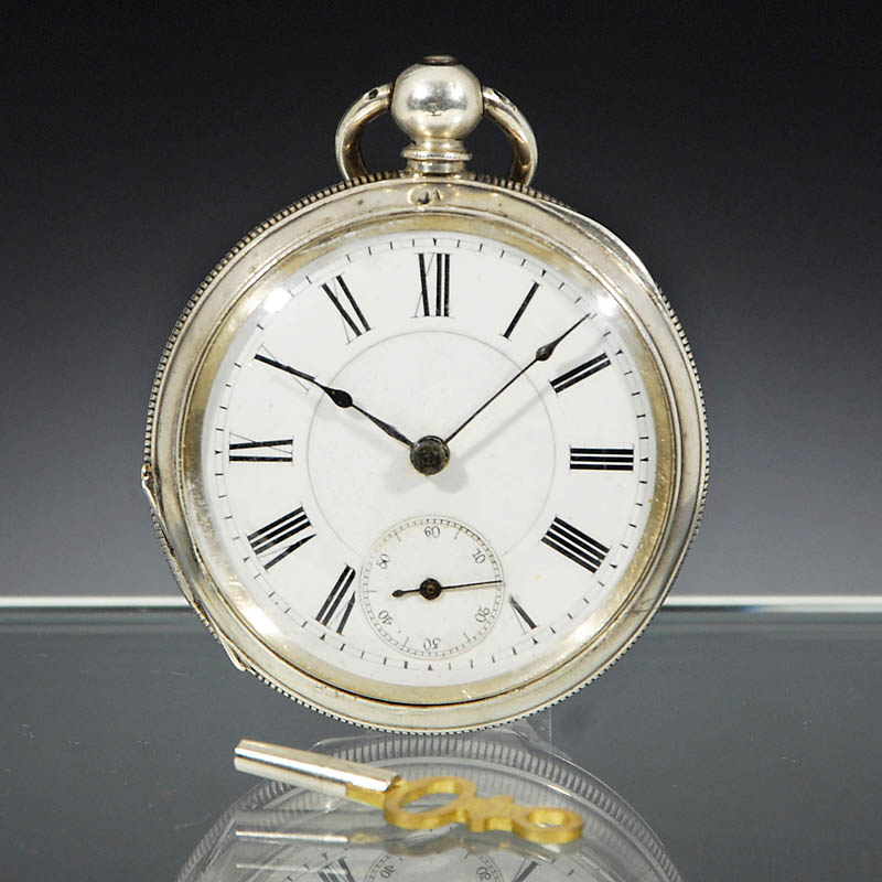1) "The Portland of Bristol", Birmingham 1884, Sterling silver, needs cleaning. 2) "Simpsons Ltd., Brighton", Swiss made, c. 1900, nickel, working. 3) "101043N" stamped on the movement, Birmingham 1888, Sterling silver, with dust cover, working. 4) "The Papagon Trade Mark, Swiss", c. 1900, silver (925), anchor escapement, needs cleaning.