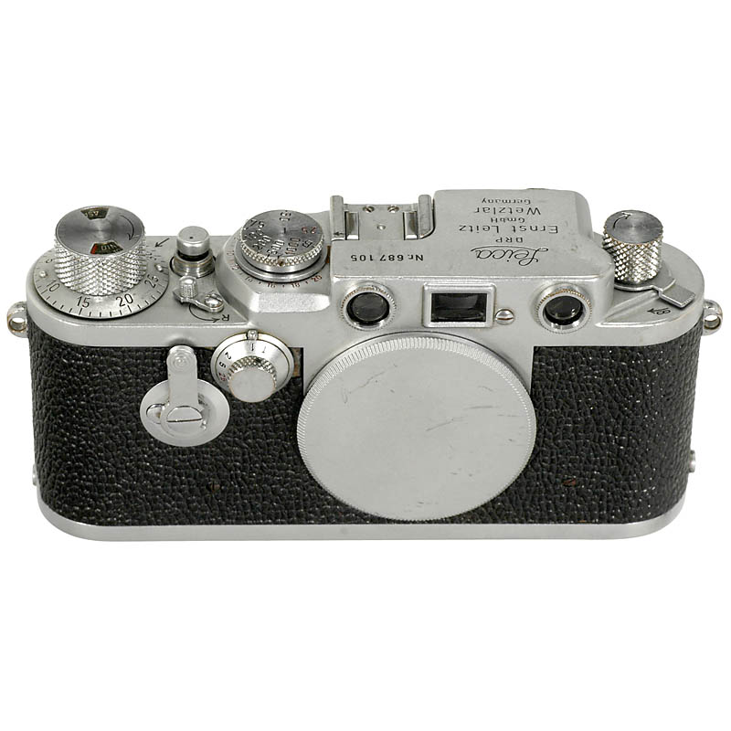 1) Leica III, no. 262868, 1937年, 镀铬, 机背上雕有 "Stapo Trier" 的文字, 附带Summar 2/5 cm镜头. 慢门粘涩. (3+/3-)