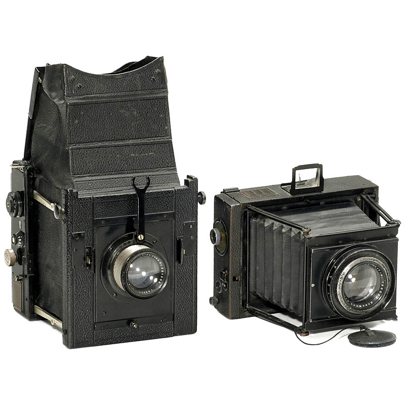 1) Ica, Dresden. Minimum-Palmos 457, 约1909年, 尺寸 10 x 15 cm, Ernon 3,5/17 cm镜头, 帘幕式快门速度 1/1000 秒. (工作), 可折叠分叉式皮腔相机, 取景屏后座, 镜头盖. (3+/3+)