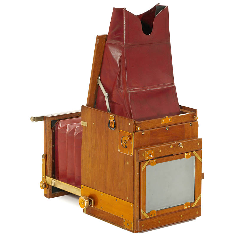 Kershaw & Sons Ltd., London. 贵重木料做的机身带黄铜和紫铜覆层, 规格 3 ¼ x 4 ¼ in., 黄铜镜头 Cooke Anastigmat 5.6/240 mm, 酒红色皮制皮腔和取景器, 帘幕式快门工作. 带相机套, Tessar 4,5/18 cm 镜头和 Tessar 4,5/15 cm 镜头.