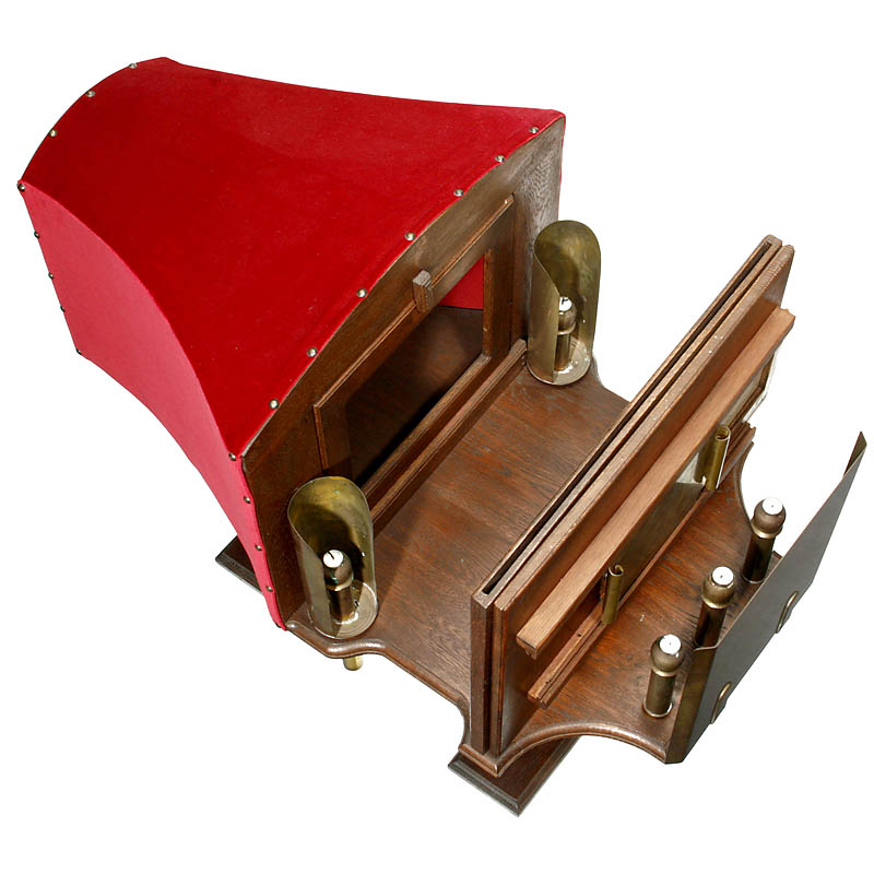 漂亮的手工制作的西洋镜, 规格为35 x 50 cm的Megalethoscope图片和带白天/夜间效果的明信片专用. 装饰盒带旋制木质支架. 西洋镜规格为: 95 x 53 x 70 cm.