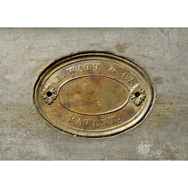 On February 14th, 1780, in England, some 230 years (!) ago, James Watt, the famous inventor of the steam engine, was granted a patent for his first duplicating machine under patent no. 1244. The machine was sold by "James Watt & Company, Soho/Birmingham, England". His invention was a result of his own business as he had permanent correspondence with his partner Matthew Boulton while traveling – mostly to his steam engine projects in Cornwall. James Watt was too often very frustrated when he received a letter after several weeks with answers by M. Boulton to his written questions because he had no copies of his own letters, of course! – So he started developing the world's first portable copying press! And by the end of 1780 150 machines had already been sold, and 630 presses by the end of the first full business year! – It is reported that in the early 1780s Benjamin Franklin, George Washington and Thomas Jefferson used the James Watt copying machine! In 1785 Jefferson was using both the stationary and the portable presses by James Watt & Co. – The portable case opened up on hinges, and its upper section contained a collapsible writing pad for preparing the documents. The typewriter had not yet been invented, and copies could be made only of handwritten letters, diagrams and drawings which were made with a special copying ink! Underneath the writing pad were compartments for pencils, pens, rulers and paper, as well as a special compartment: The "damping box" which was used for treating the copying paper. After 12 hours, the sheets were thoroughly moist, and thus treated and ready to be used for copying. The number of sheets required for immediate use could be removed, and the remainder could be left in the box for up to two weeks, ready to be used at any time. – The actual copying apparatus, consisting of two brass platens which were turned via the side handle, which was also located in the bottom section of the case. The original document was placed in the copying plate in between the feltcovered, swing-up cover plate; the moist – very thin – copying paper was placed on top of it, and was then covered by oilpaper. The pressure induced by slowly turning the plate between the two platens caused the special copying ink of the original to be taken over, and thus transferred, onto the moist sheet (mirror inverted). The copy was ready for use after 24 hours in a drying book of absorbent paper. Because the ink was passed through in this manner, the printing on the copy could, of course, be read only on what was actually the reverse side of the page. The base for good copies was the special copying ink in which the original was written. A great deal of practice was also necessary to prepare sheets for use as copying paper, as they had to be uniformly moistened. The "damping box" shows the original seal of James Watt. Including moistening brush, ink pot, keys, copying paper, fragmented manual and dry ink powder. – Extraordinarily hard to find in this complete condition!