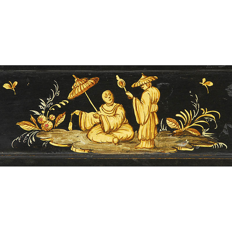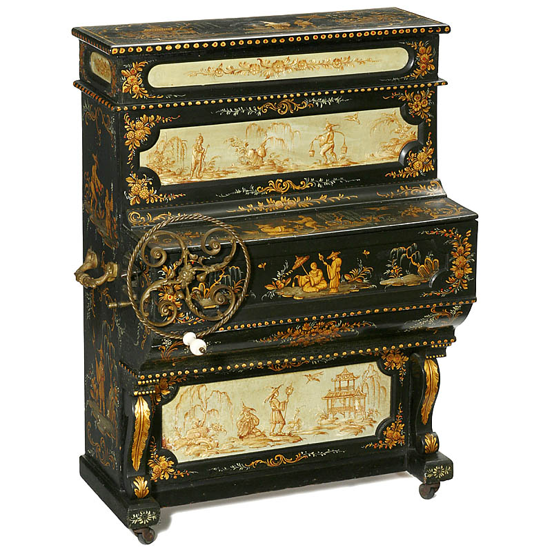 Hand-cranked barrel piano (unmarked) with pinned wooden barrel for 8 melodies, 28 notes and 11 bar-type bells, size 26 x 16 x 34 in., working but needs tuning. 4 sides of the case are lavishly decorated with handpainted Chinese motifs. – A unique eyecatcher!