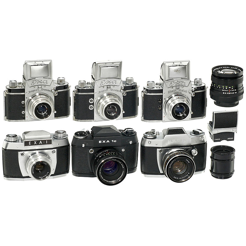 2) Exa, no. 410005, version 4.1, 1956, Tessar 3,5/5 cm T, no. 3103613, waist-level viewfinder.
