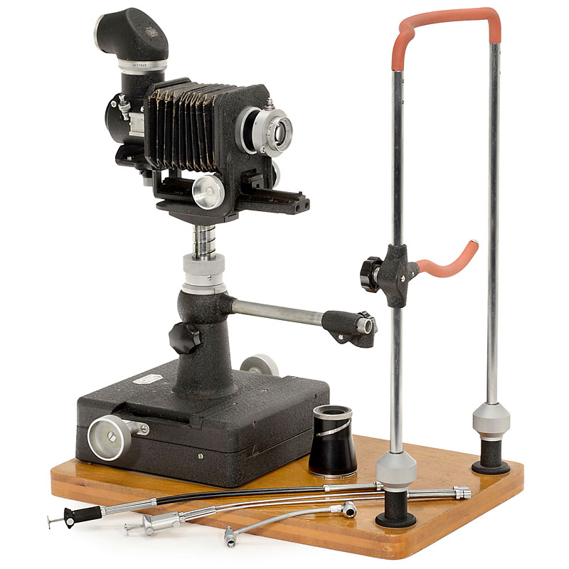 Leitz, Wetzlar. Equipment for macro photography of the human face. Solid base can be moved by rack-andpinion in all directions. Fitted with Bellows I, Visoflex I, 2 magnifiers, 3 release cables, Elmar 4/9 cm with special squeeze aperture. Extremely rare!– Literature:"Leica Cameras", Wittig 1984, p. 80.
