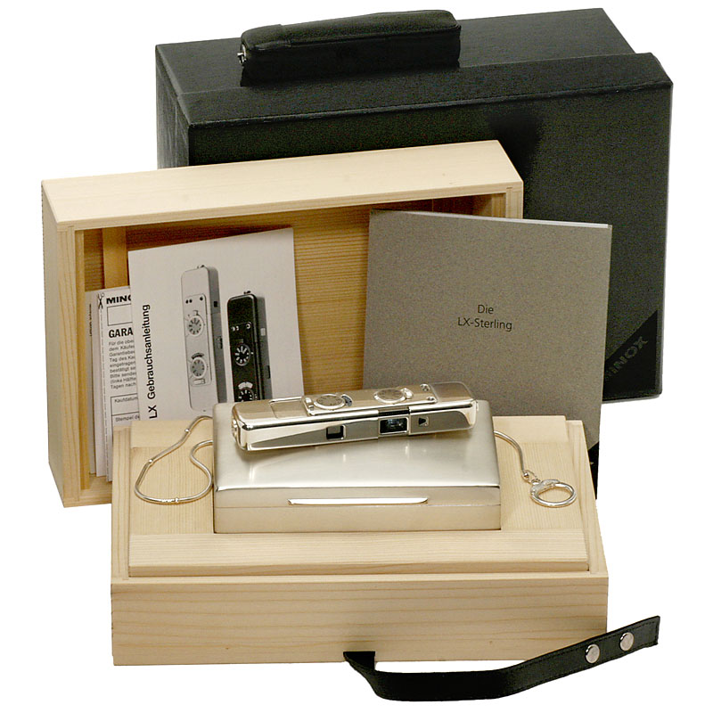 Minox, Gießen. No. 53-1992, the most exclusive Minox ever made, hand-made from 925 sterling silver, just a few examples on order. The camera should be touched only with the provided cotton gloves. Complete with paperwork, dedication by Walter Zapp, chain, leather case. Kept absolutely safe in padded metal case, wooden box with leather strap, and outer cardboard box.
