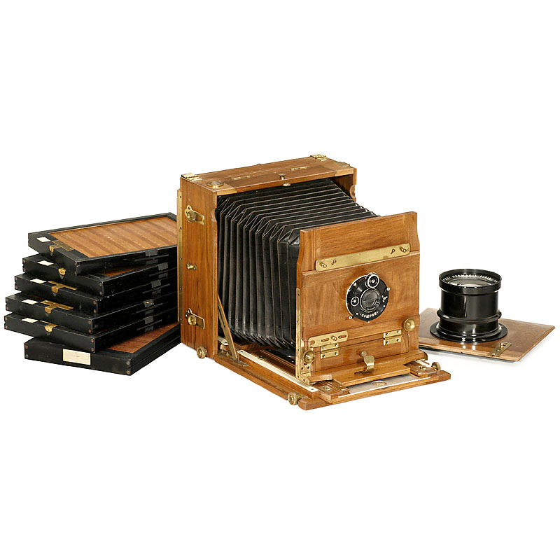 With 2 lens boards. With case and 6 wooden double cassettes.