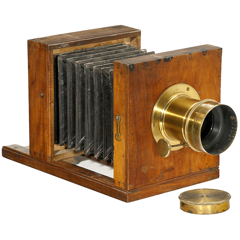 Presumably French. Polished wood with simple brass trim, black bellows, focusing screen back, camera with collodion stains. – Lens:unmarked (Petzval-type), lens size: height 6 in., Ø 3 1/6in., rack-and-pinion focusing, brass lens cap.