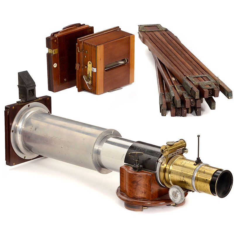 Ross, London. Body no. 2364. Very rare and unusual plate camera for close-up shots, plate size 3 1/6x 3 1/6in., telescopic aluminum tube (extending 7 4/5–14 in.). Special Zeiss lens "Tele-Tubus III" with "Tele-Positiv 1:3 F=135 mm", serial no. 34638, in Zeiss special shutter (not working). – Accessories: Focusing screen back, special rollfilm back by Eastman-Kodak, double cassette, viewfinder, wooden head and wooden tripod. – Extremely rare model, similar to the later Dallmeyer "New Naturalists Camera".