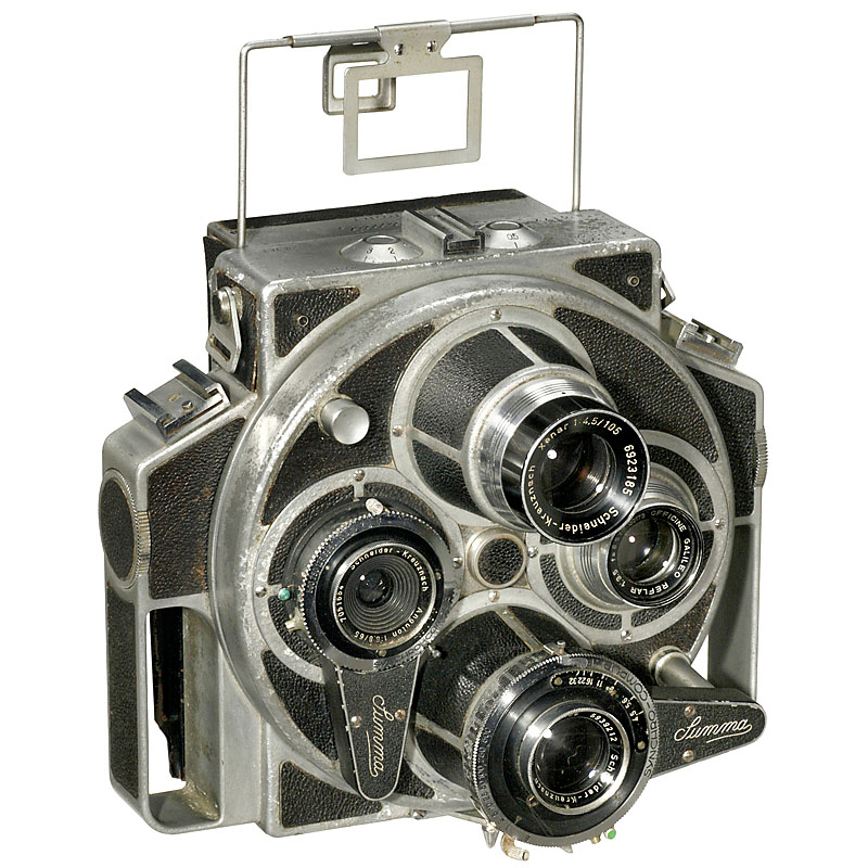 Tiranti, Rome, Italy. Unusual professional press camera with two pairs of lenses (Schneider Angulon 6,8/65 mm and Xenar 4,5/105 mm) in Synchro-Compur. Shutter stuck, camera body and mechanism need attention. Film size 6 x 9 cm on rollfilm cassette, body no. 0177, focusing screen back. Total production probably approx. 150 units only!