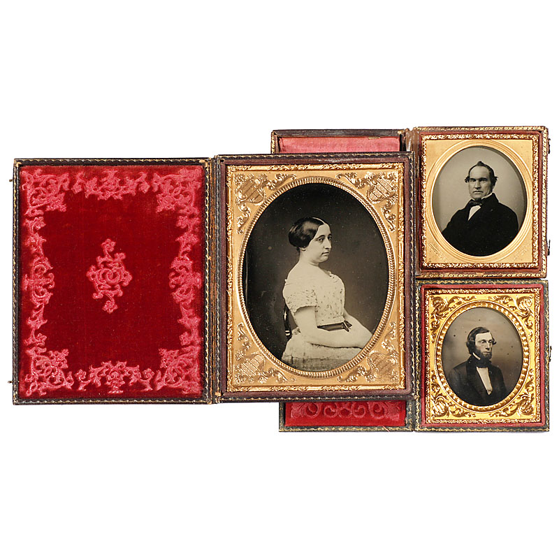Presumably USA. 1) Portrait of a lady, visible image size: 3 ½ x 4 ¾ in., copper passe-partout, Union Case. – 2)Portrait of a gentleman, visible image size: 2 x 3 1/3 in., hand-colored, copper passe-partout, Union Case. – And:3) "Ambrotype by Chace & Hawe", portrait of a gentleman, visible image size: 2 1/3x 2 ¾ in., copper passe-partout, Union Case.
