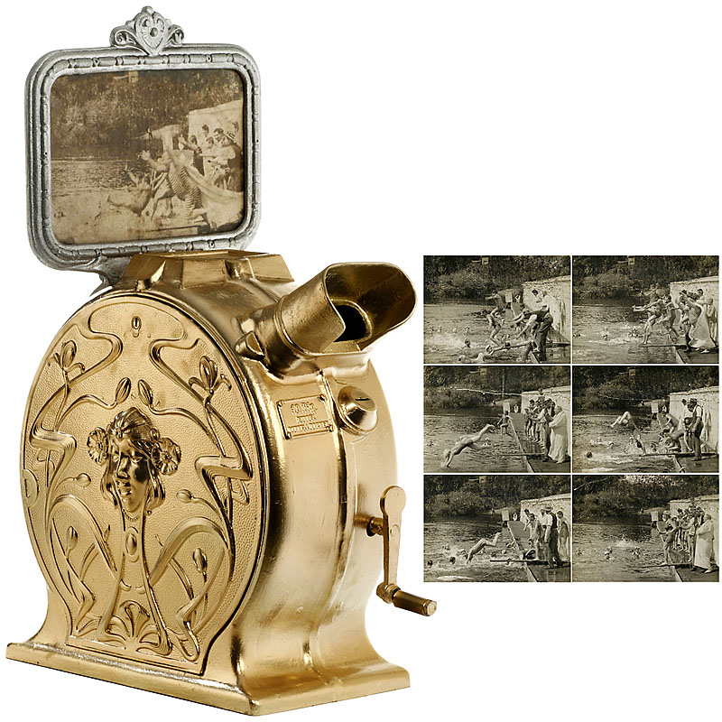 Exceptionally rare table model of early Berlin production, with wonderful decorative art-nouveau motif on both sides. Probably from the very first and only prototype seriesas nearly nowhere else known. With original Mutoscope reel "A summer day at the lido". Marquee sign probably later. – A fascinating rare collector's item and museum piece!