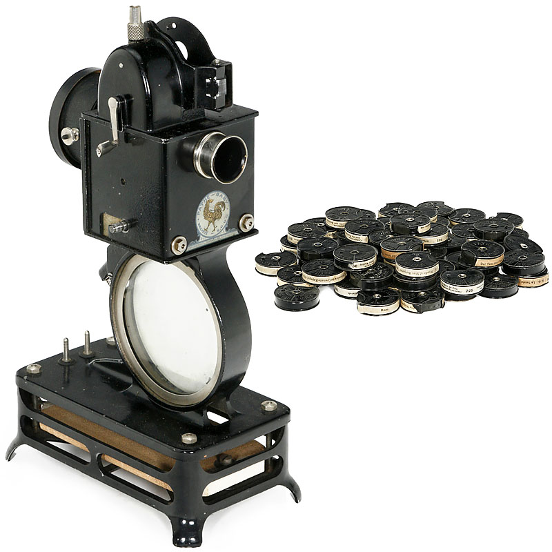 By "Pathé, Paris", missing crank, in original box, with approx. 90 films in tin cassettes.