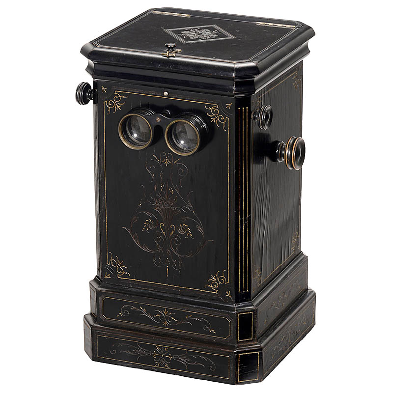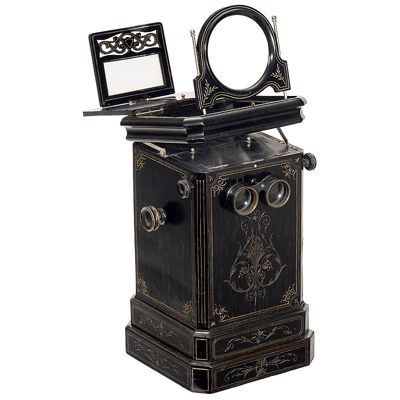 A rare combination, used for glass stereo slides of 9 x 18 cm, lid with buildt-in graphoscope (suitable for multiple sizes), paternoster system, for 60 stereo slides, focusing lenses, ebonized wood case with incised gilt decoration, size 12 x 12 x 18 ½ in