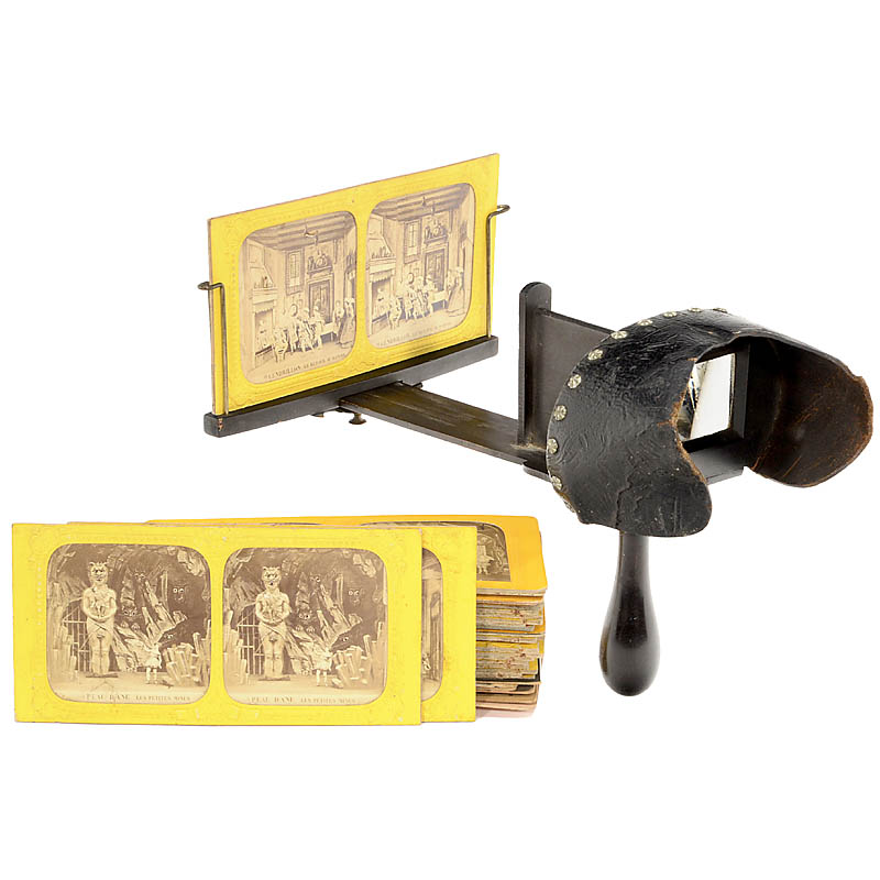 Black stereo viewer for 3 ½ x 7 in. (9 x 18 cm) cards. With approx. 29 colored (mainly tissue) stereo cards, colored, some small tears.