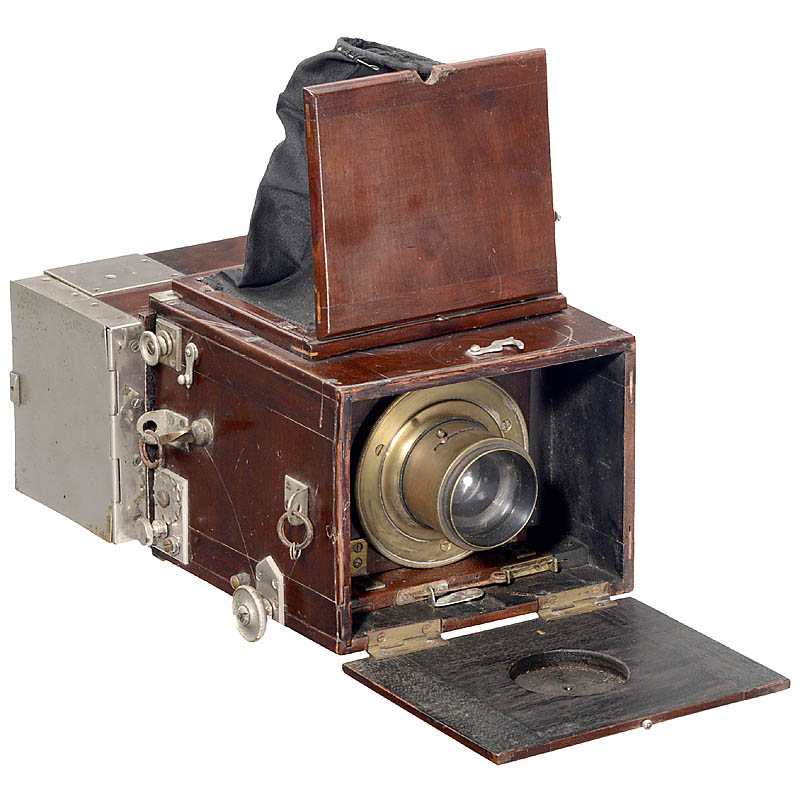 Unmarked, presumably England. Size 6,5 x 8 cm, polished cherry wood body with nickel trims, focal plane shutter (damaged), unmarked brass lens with iris stop, changeable magazine.