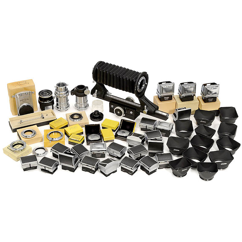 Ihagee, Dresden. Exakta "Lichtmeß-Einrichtung", Iha gee bellows, 5 rings, Zeiss low-power scanning lens M 2,3/15 mm, 7 reflex screens for focusing, trip coupling, magnifying viewfinder, 2 prismfinders, 20 waist-level viewfinders and 12 Exakta lens hoods.