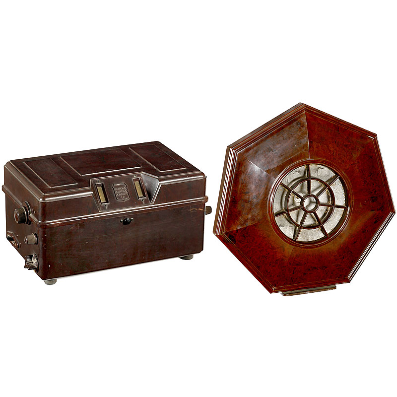 1) 4-valve receiver, mains-operated, in bakelite case. – And: 2) Bakelite loudspeaker type 2109. – Both cases in good condition.