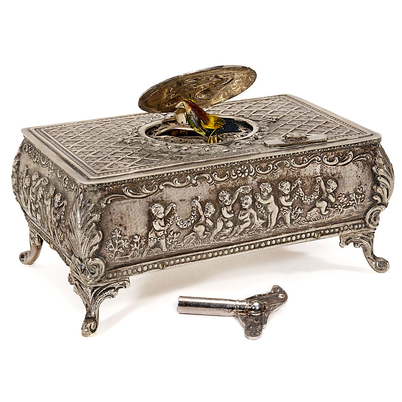Mechanical singing bird automaton by "Karl Griesbaum", Germany, key-wind clockwork mechanism. The bird sings and turns around, flaps his wings and opens and closes his beak while singing. In elaborately designed silver case, with hallmark 925. Decorated w