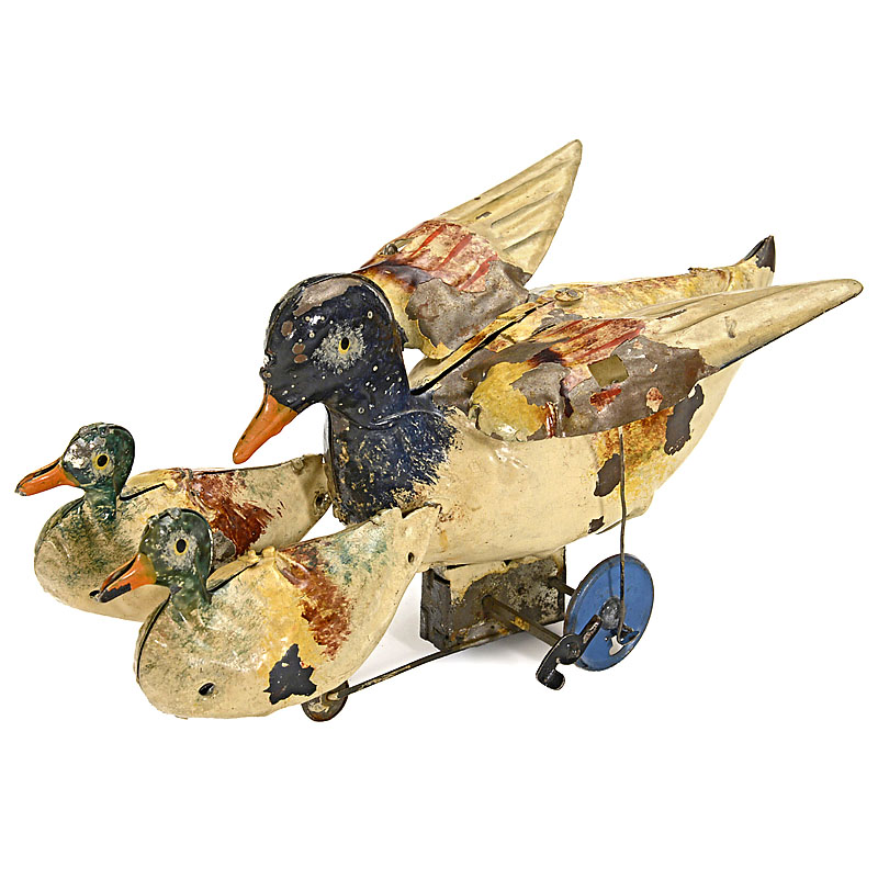 Max Moschkowitz, Nuremberg; hand-painted tin, clockwork (working), with simulated flap, length 8 2/3 in.
