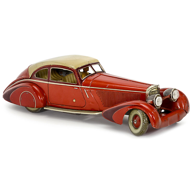 Nuremberg; roadster, lifelike model of the "Mercedes 540 K Coupé", lithographed tin, clockwork (working), electric headlights, driver figure, length 13 ½ in. – Literature: 1) P. Ottenheimer, "Spielzeugautos", Zürich, 1984, p. 160/1. – And: 2) Werner Oswal