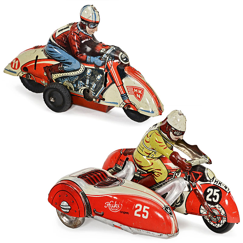 Hubert Kienberger, Nuremberg. lithographed tin. 1) HK-41, with sidecar, clockwork (working), length 3 ½ in. – And: 2) HKN-11, friction (working), length 3 ½ in.