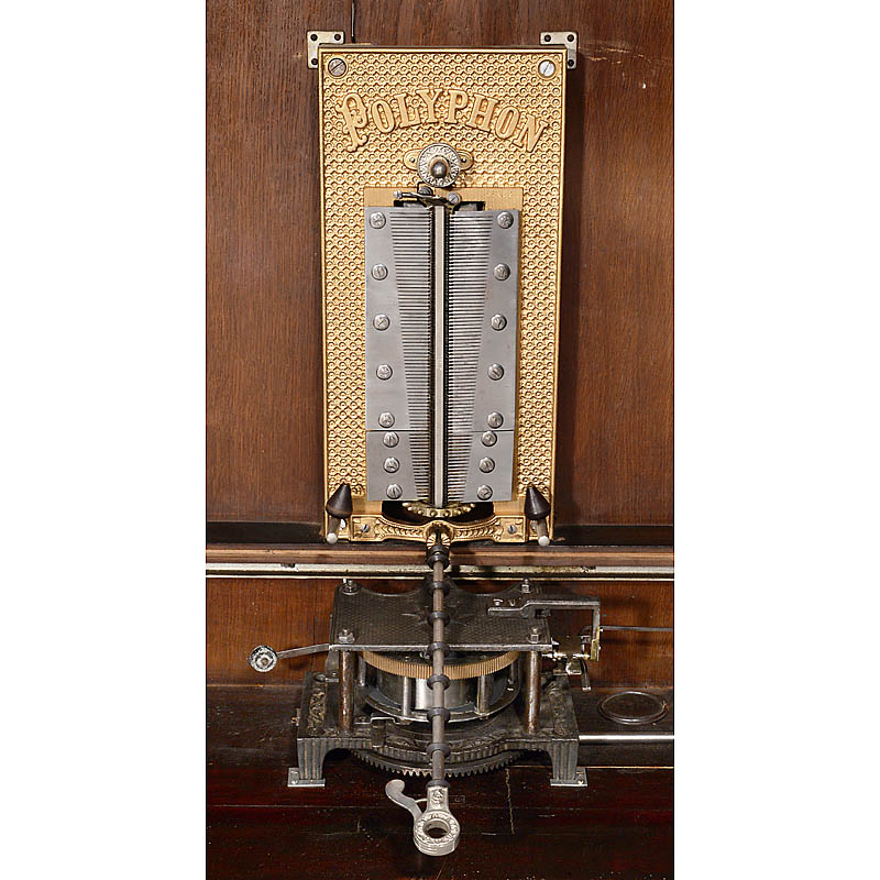 Style 105, manufactured by: "Polyphon Musikwerke, Leipzig", 159-teeth in duplex comb (complete), in walnut case with original gallery and retailer's plaque: "T.E. Bevan & Co., Calcutta", size 32 x 16 ½ x 57 in. Private home model produced without coin-slo