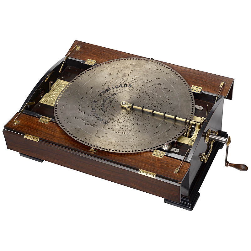 Manufacturer: "Polyphon Musikwerke, Leipzig", with 118 teeth in duplex combs plus 16 bells (complete!!), spiral-spring motor, grained wooden case with four-piece folding casket-lid and 2 carrying handles. With 25 discs. – Only a few of these instruments w