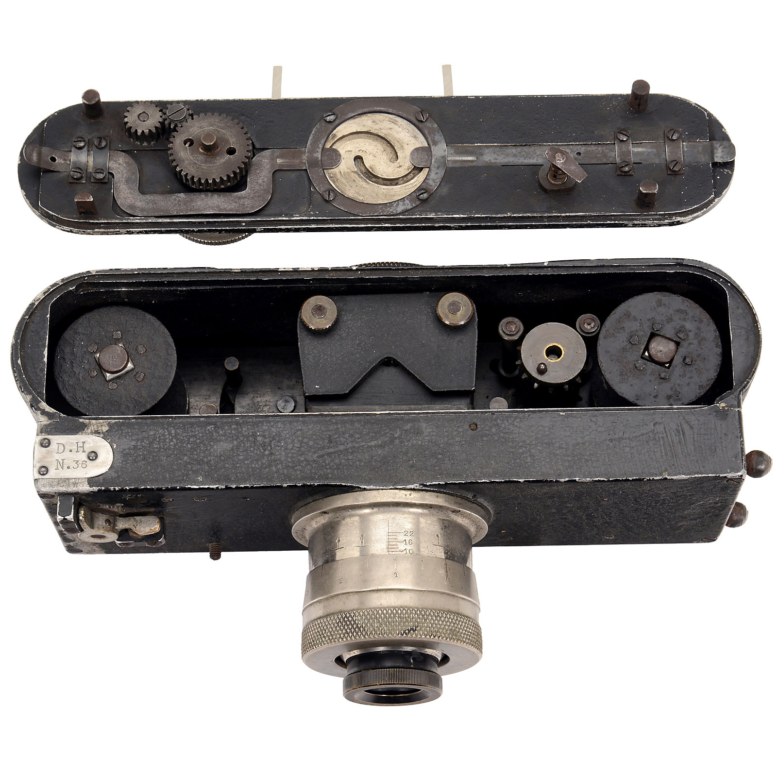 The Forerunner of all forerunner cameras! Presumably produced by Goerz in Berlin, size 24 x 32 mm, metal focal plane shutter (not working), body marked no. "D. H N.36" and "36" inside, rangefinder marked: "C.P. Goerz, Berlin". Lens: C.P. Goerz, Berlin, Serie C No. 00, 1:4,5. Size of the camera: width 9 ½ in. x height 4 1/3 in., weight 2,66 kg. – Very early 35mm still camera and Leica forerunner. – A sensation! Provenance: Collection Dr. Loher, Munich.