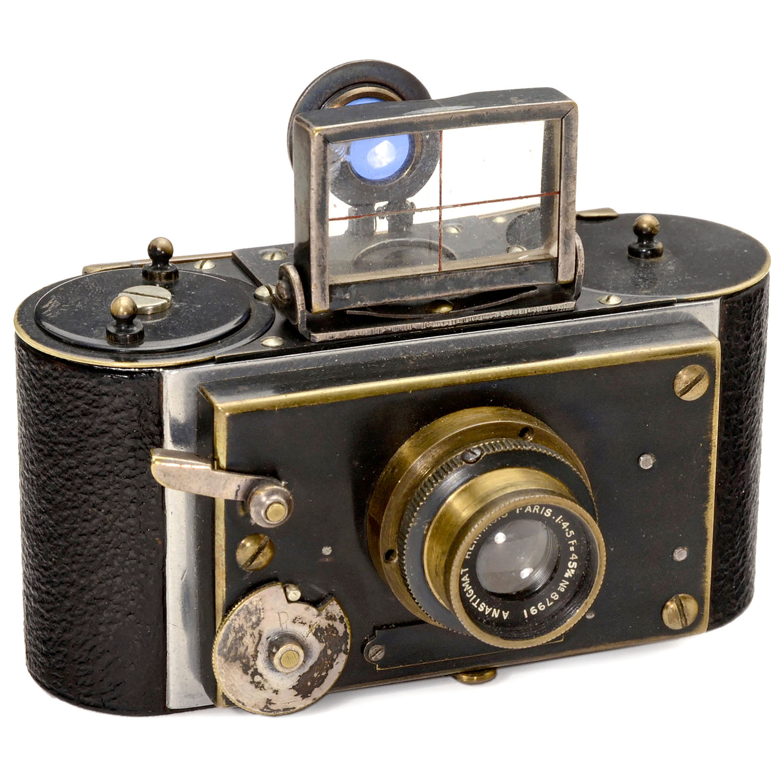 E. Guerin, C. Pingault & Cie., Paris. For 25 exposures 24 x 36 mm on 35mm perforated film, body no. 13! First model with leather covering, lens: Hermagis 4,5/40 mm, no. 87991, shutter I + P, first version without inscription. This is the smallest of all pre-Leica 35mm cameras. – Very rare camera in excellent condition!