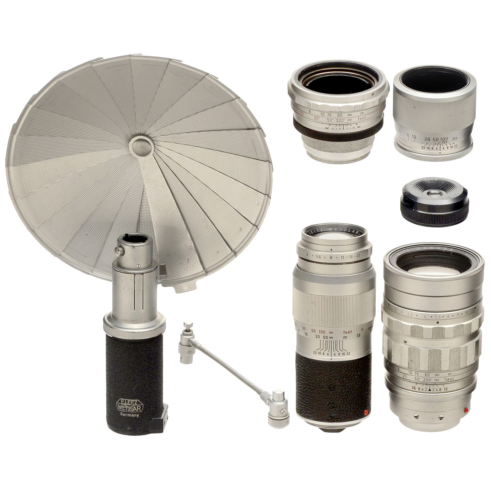 1) Leitz, Canada. Summicron 2/90 cm, chrome, no. 1741070, screw-mount, rear cap, fungus. (3/5) – 2) Leitz, Wetzlar. Elmar 4/135 mm, no. 1801898, screw-mount, diaphragm faulty, fungus. (3/5–6) – 3) Accessories: Leitz flash CEYOO, 2 extension rings, cable OZXVO and special rear cap OSBLO.