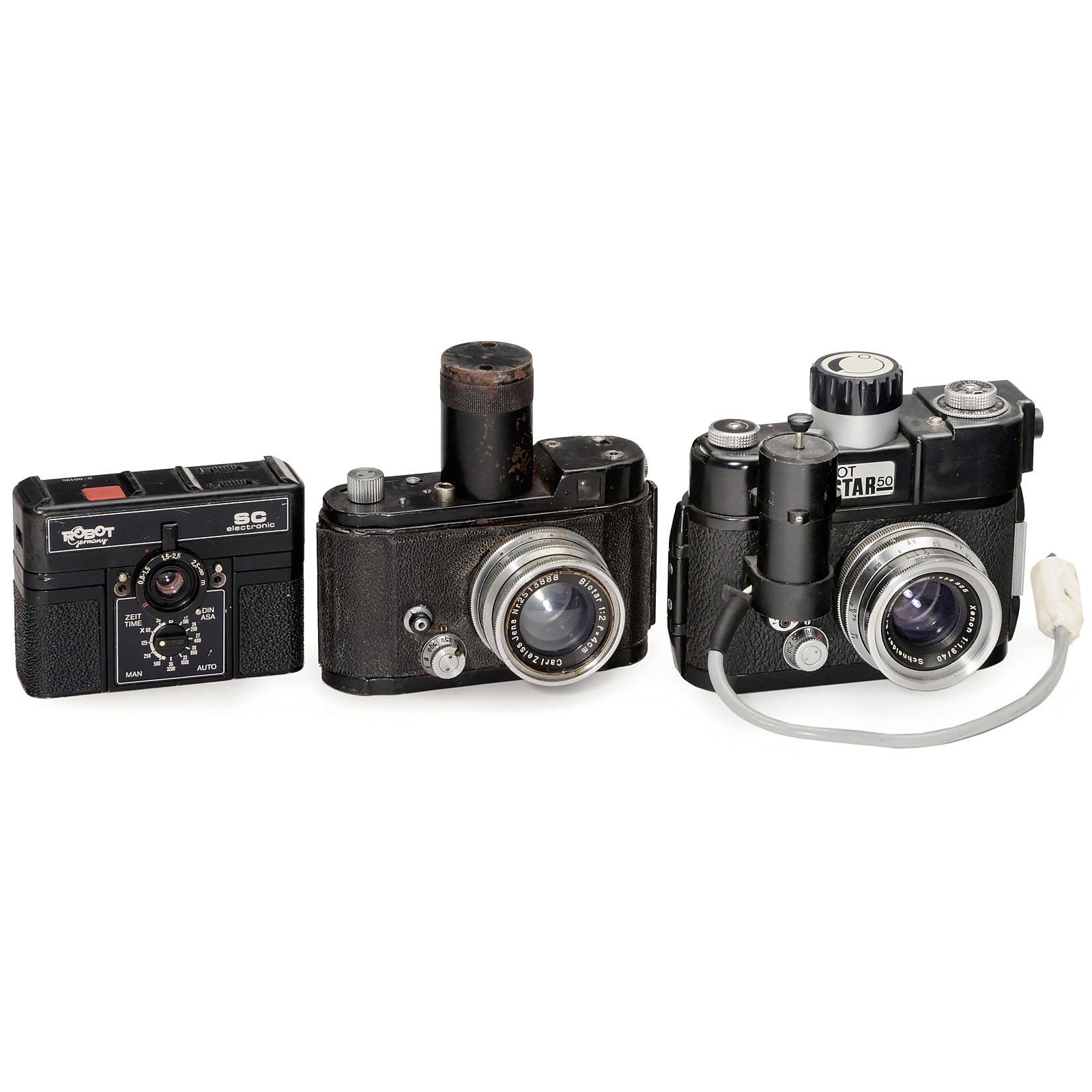Berning, Düsseldorf. 1) Robot II "Luftwaffen-Eigentum", 1940, no. F 38441-7, Biotar 2/4 cm, no. 25138/88, 2 cassettes. (4/3–4) – 2) Robot Star 50, without body number, with special release: special silent version of East German Secret Service "Stasi", Xenon 1,9/40 mm. (3+/3) – And: 3) Robot SC Electronic, c. 1982, size 16 x 16 mm on 35mm film, Schneider Xenagon 5/30 mm, electronic shutter (not tested) and motorized film transport. Not much bigger than a cigarette pack. (3/–)
