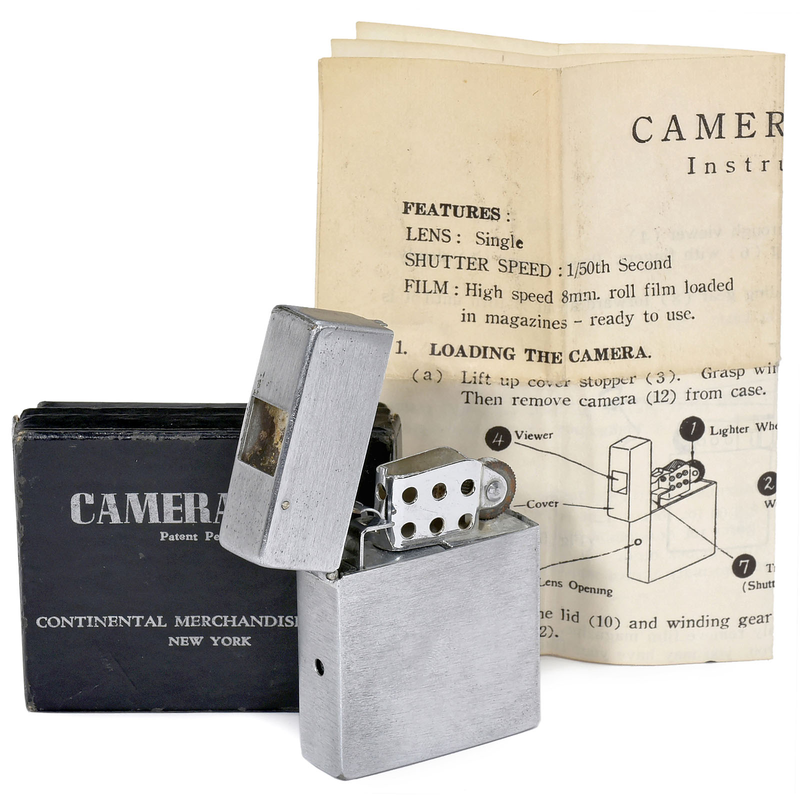日本 Suzuki 制造(Continental Merchandise Co., Inc. New York),底片规格6x6mm,8cm胶卷,镜头规格:Meniscus 8/17mm, 快门速度 1/50秒,带原始包装盒和说明书。是非常少见的 Camera-Lite 第一版!