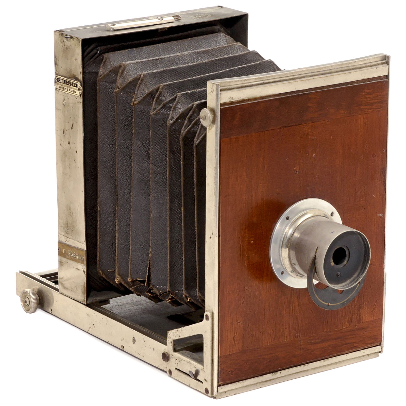 Compagnie Française de Photographie, the same manufacturer as the "Photosphère"! Nickel-plated camera of unusual construction. Base and lens board of tropical wood. Rear extension, no. 135. "Patent no. 8257, 22 June, 1886". Landscape lens with rotating diaphragm in lightweight nickel-plated mount, bellows with holes. – One of the first tropical cameras, solid construction!