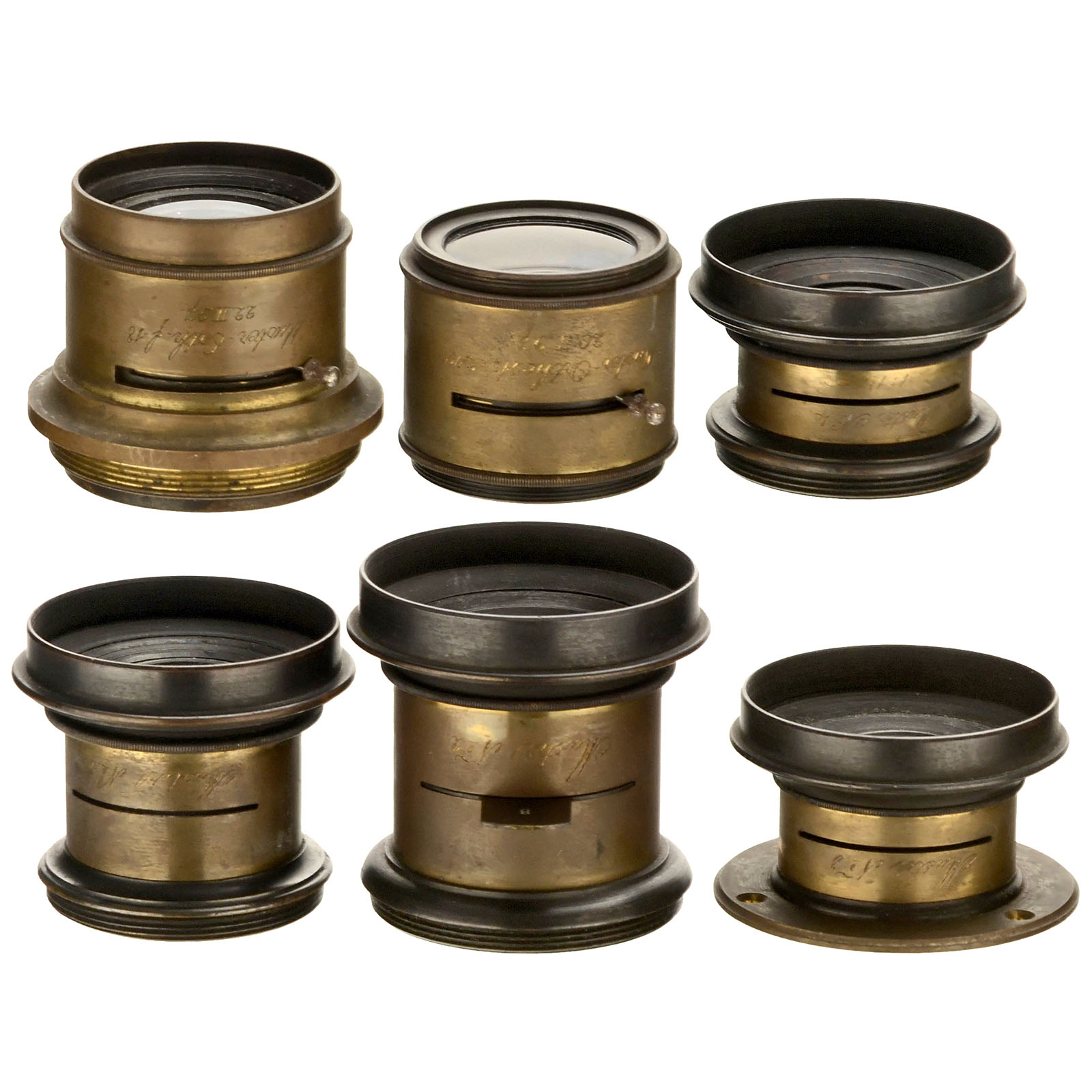 Steinheil, Munich. Engravings: 1) "Muster No. 1". – 2) "Muster No. 2". – 3) "Muster No. 3". – 4) "Muster No. 4 1:18". – 5) "Muster-Optik f=18 22.II 97". – And: 6) "Muster-Orthost.=240 20.II 97". – Focal length approx. 180–240 mm. 5 lenses for waterhouse stops and one lens with iris stop. Height of the lenses: 1 2/5 to 2 in.