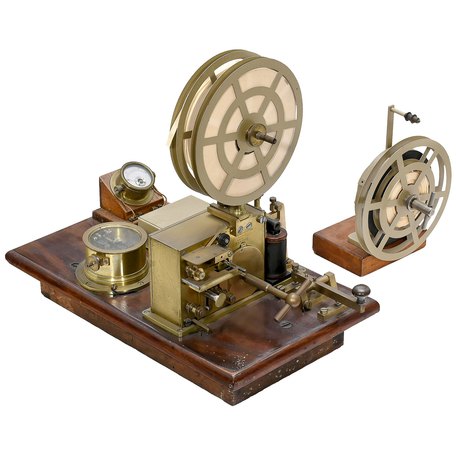 Consisting of: Siemens & Halske ink-writer telegraph, serial no. 37127, with working clockwork motor; Morse key; relay by C. Lorenz AG, Berlin and an English voltmeter; on wood base, overall size 21 x 12 x 20 ½ in. – In addition: Separate clockwork-driven coil.