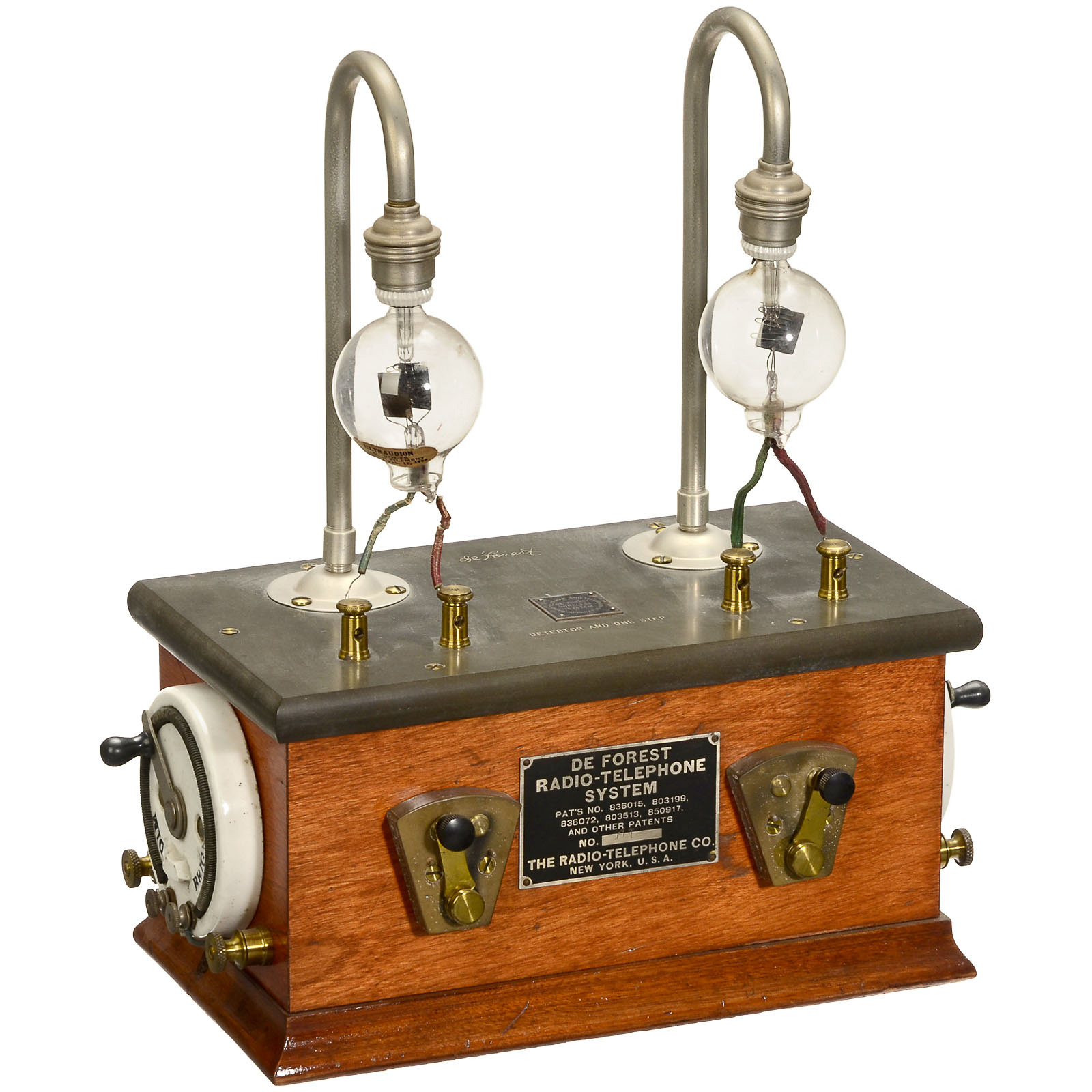 Maker unknown. Early American radio model, labeled "De Forest Radio-Telephone System", wooden case, ebonite lid, 2 ceramic resistances, 2 Audion valves in gooseneck mounts. An interesting construction and an attractive exhibition piece. – See also: www.radiomuseum.org!