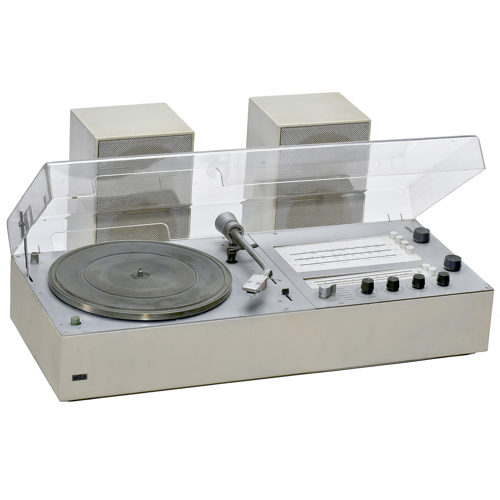 1) Neckermann WPR 9666 W, with record-player. – 2) Loewe Opta Bella-Luxus, type 4713 W. – 3) Blaupunkt Barcelona. – And: 4) Neckermann Triumph W 111/35 (Körting). – All radios complete with tubes, magic eyes, rear covers and mains wires. – In addition: Braun Audio 450 radio system with loudspeakers, c. 1968.