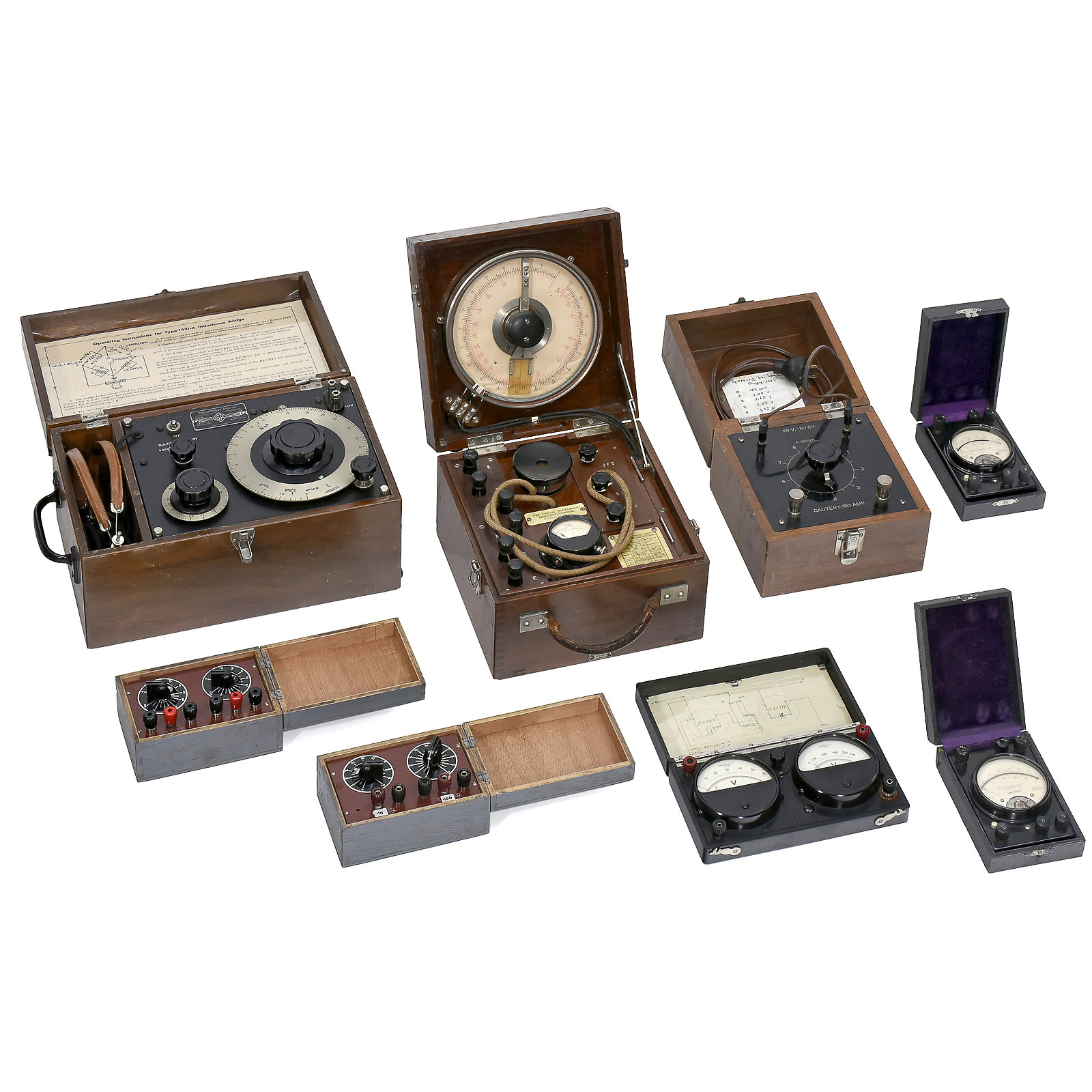Voltmeter, amperemeter, voltage regulators and tuning instruments with headphones.
