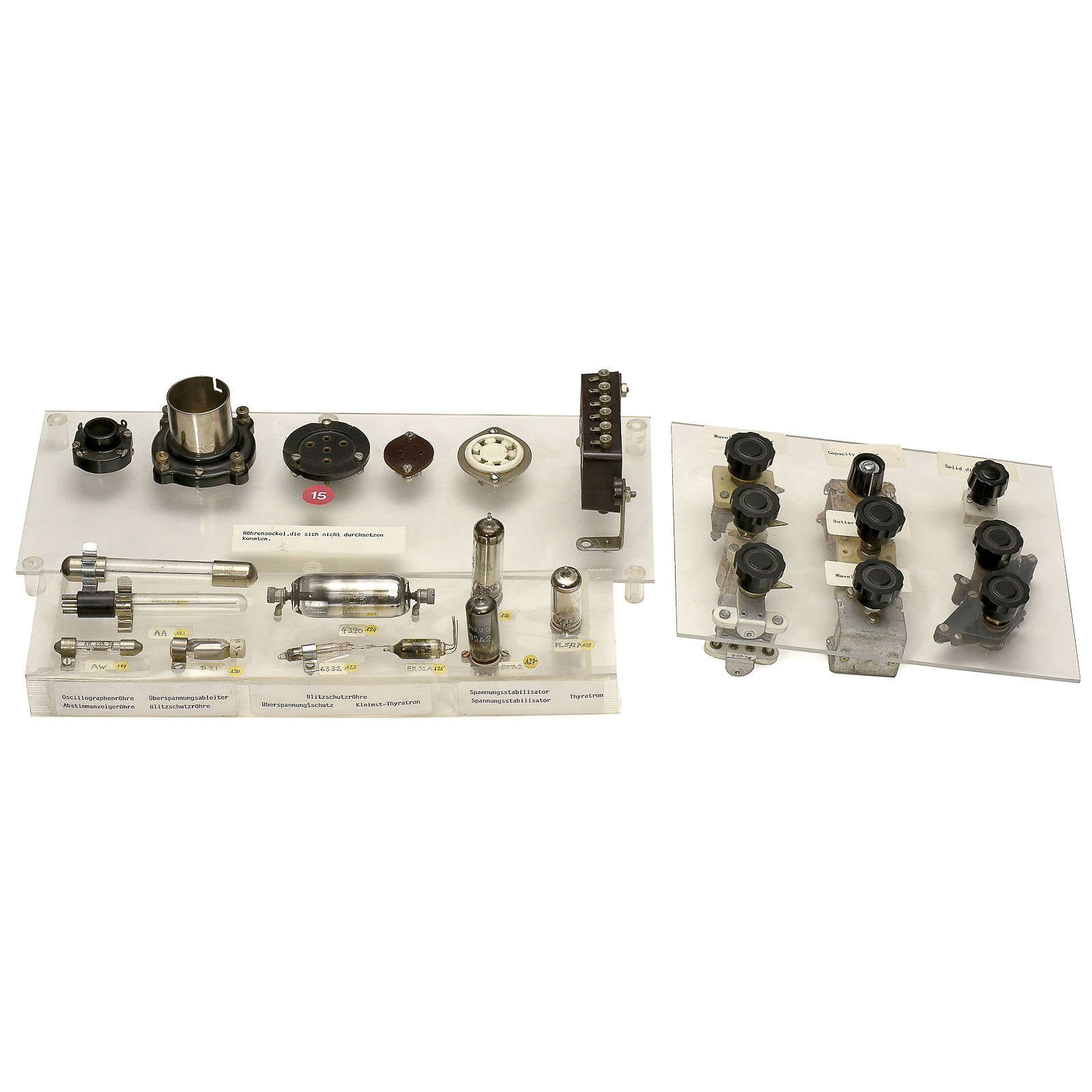 On presentation stands, including following parts: rectifiers, cathode ray tubes, light-protecting tubes, nixie tubes, unusual sockets, trimmer, wires, amplifier tubes and much more. – A total of more than 100 pieces!