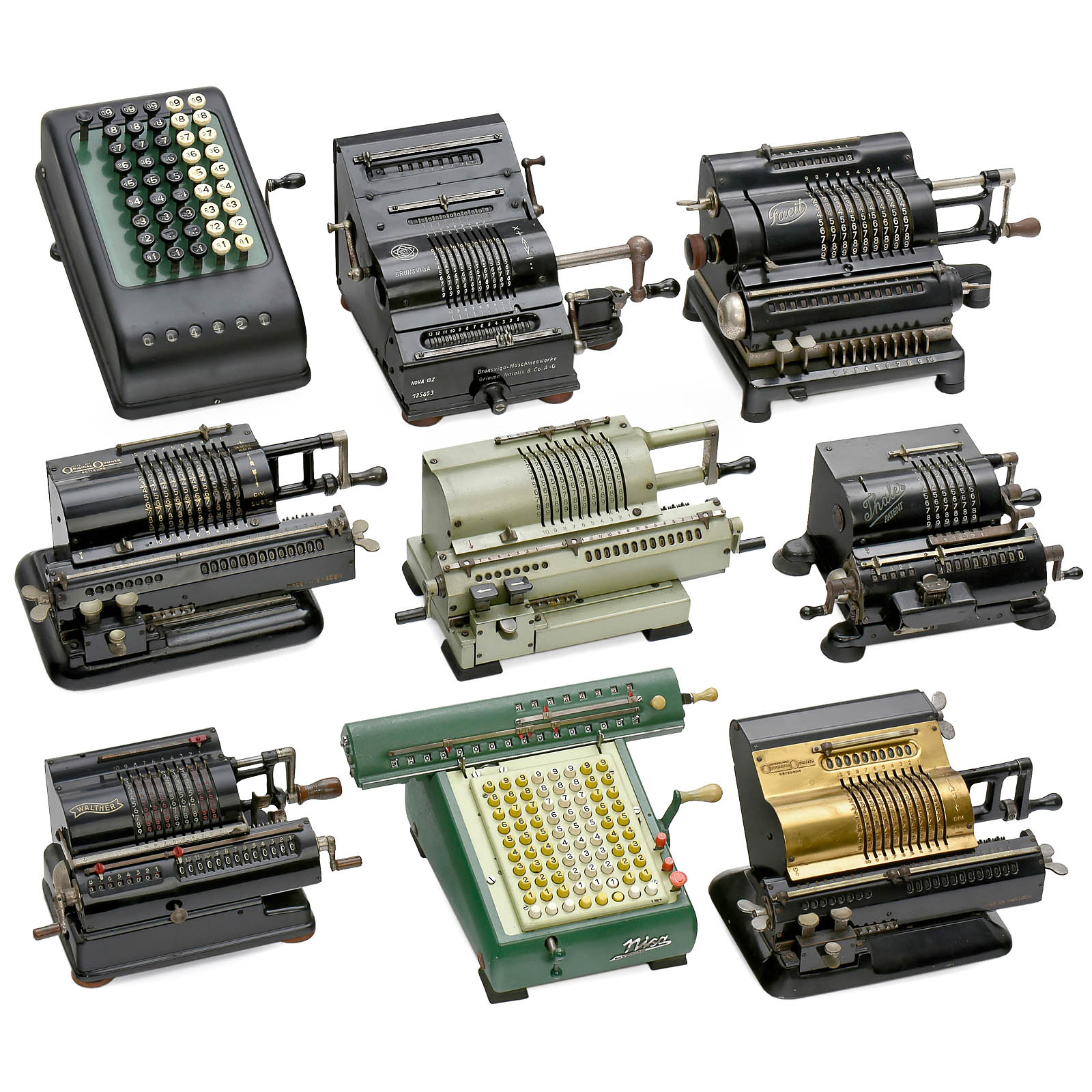 1) Thales Mod. M. – 2) Odhner Mod. 14. – 3) Facit S. – 4) Walther RM. – 5) Brunsviga Nova 13Z. – 6) Facit, serial no. 8253. – 7) Original-Odhner Mod. 7. – 8) Burroughs No. 5A. – And: 9) Nisa Mod. C (Monroe).