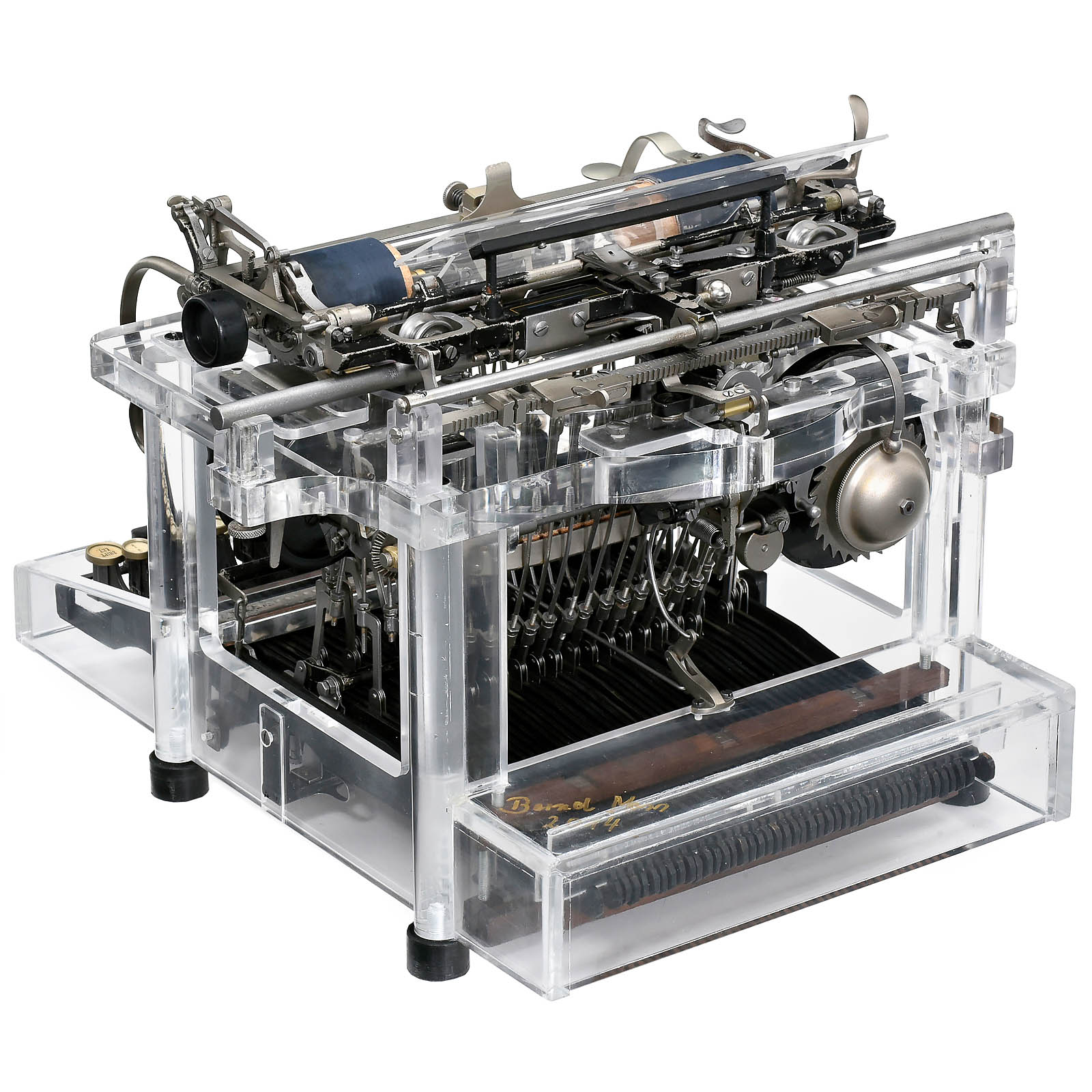 An extravagant artwork using all-original machine parts from the legendary American upstroke typewriter of 1896. In top working condition. – Signed in gold by the artist. – An absolute masterpiece of design!