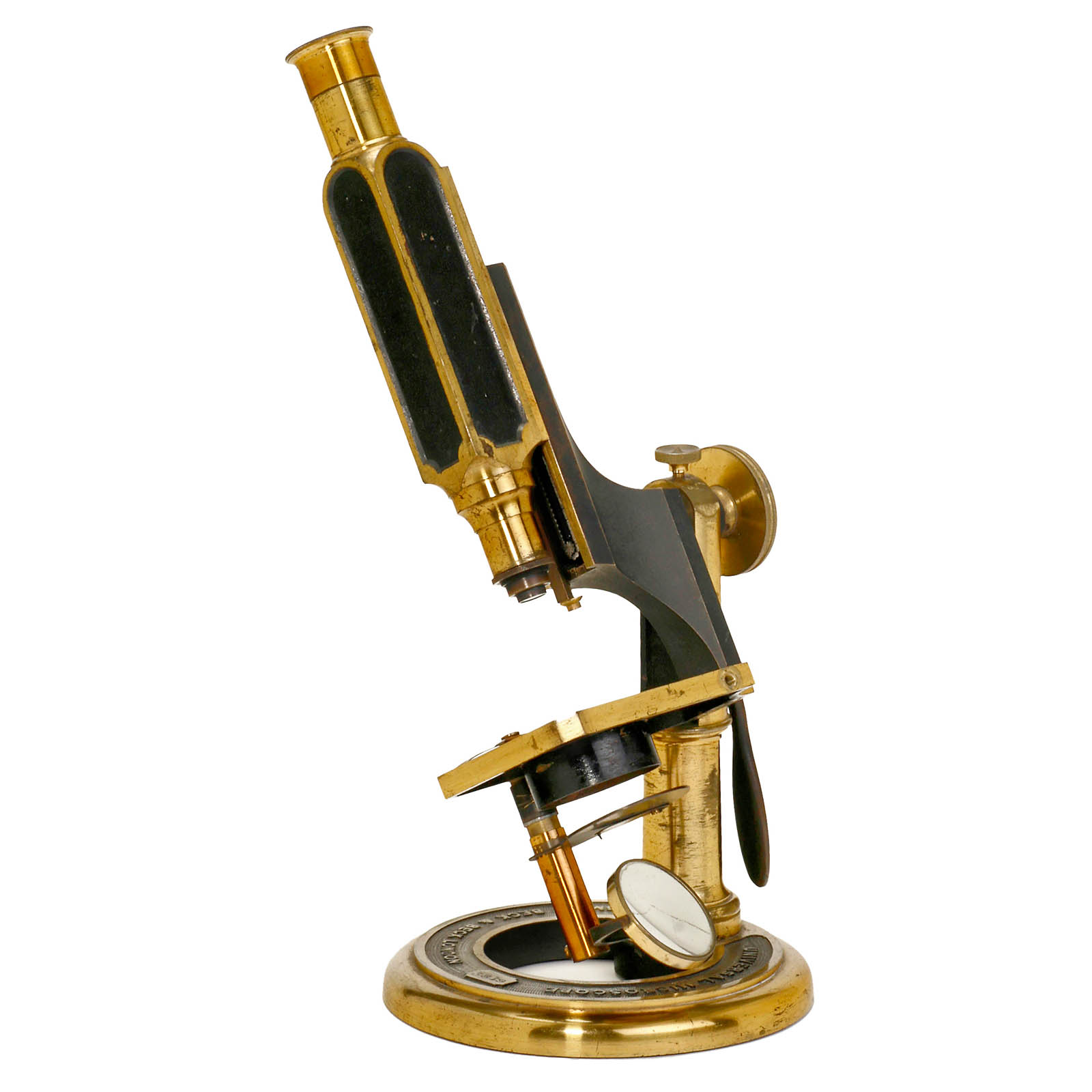 Signed on the circular base: "Universal Microscope, Smith, Beck & Beck, London", serial no. 3819, original lacquered and oxidized brass, single concave mirror, simple diaphragm with stop, laterally swinging stage and square body tube, fusee chain focusing, 1 objective, 1 ocular, height 12 ¼ in. – A microscope of unusual construction.