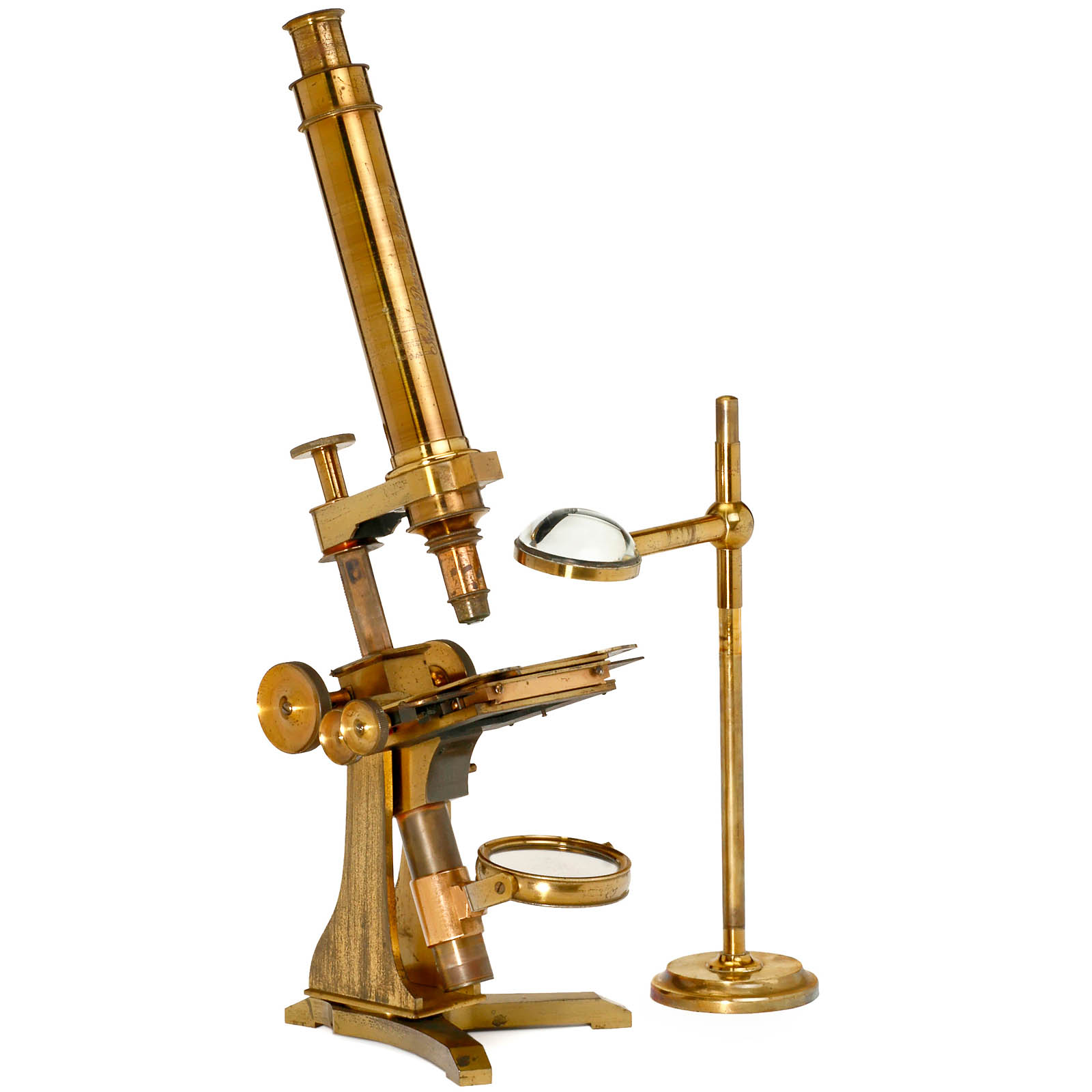 Signed on the foot: "A. Ross, London", no. 572, lacquered brass, tilting stand, large double-mirror, mechanical cross table, rack-and-pinion focusing, tube engraved "Inland Revenue Laboratory", 1 ocular, 1 objective, height 17 ¼ in. With bull's-eye condenser on stand, in fitted mahogany case.