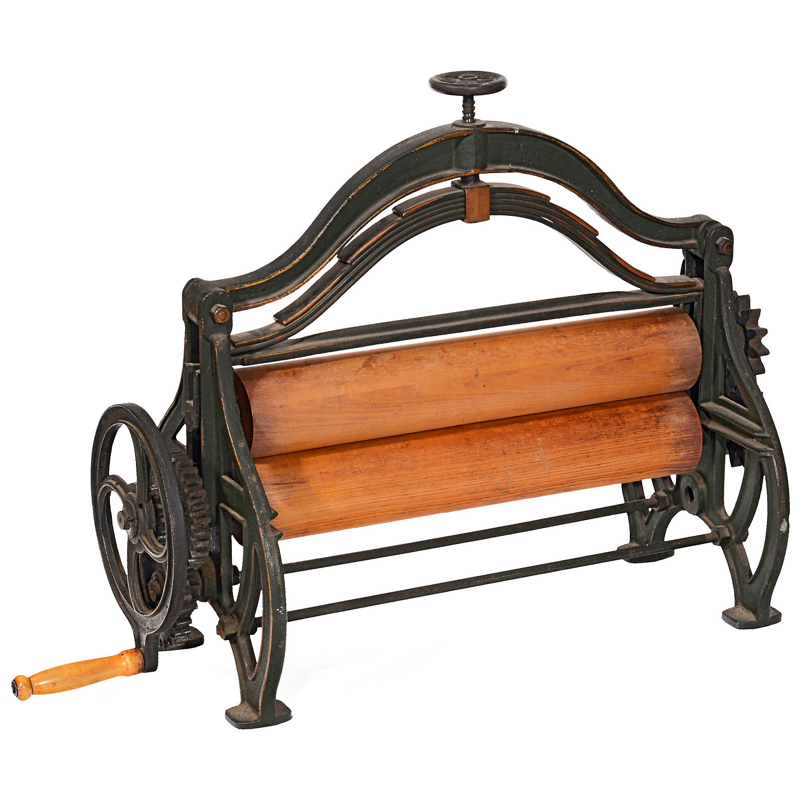 Used to press organ books, cast-iron with wooden barrels, overall width 36 in., working.