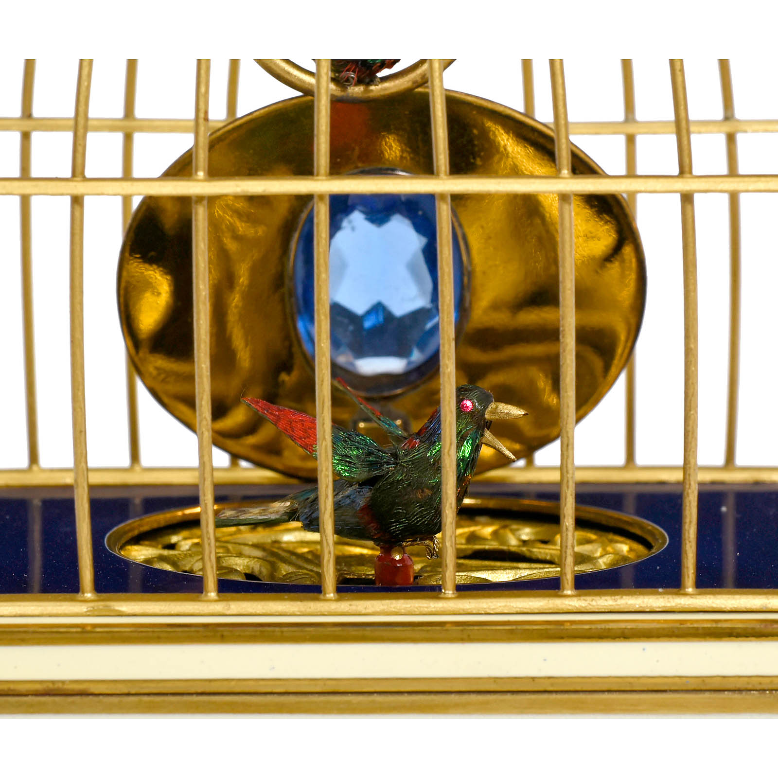 Triberg, Black Forest, Germany. Model K 1053/3, with going-barrel movement, bird with iridescent plumage, moving metal beak, wings, perch and tail, a second (static) bird swinging on perch in domed brass cage; on brass, blue and cream enameled base with drawer for the key, height 6 in. (15,5 cm), no key, in original card box. A rare and stylish singing bird box, in good working condition.