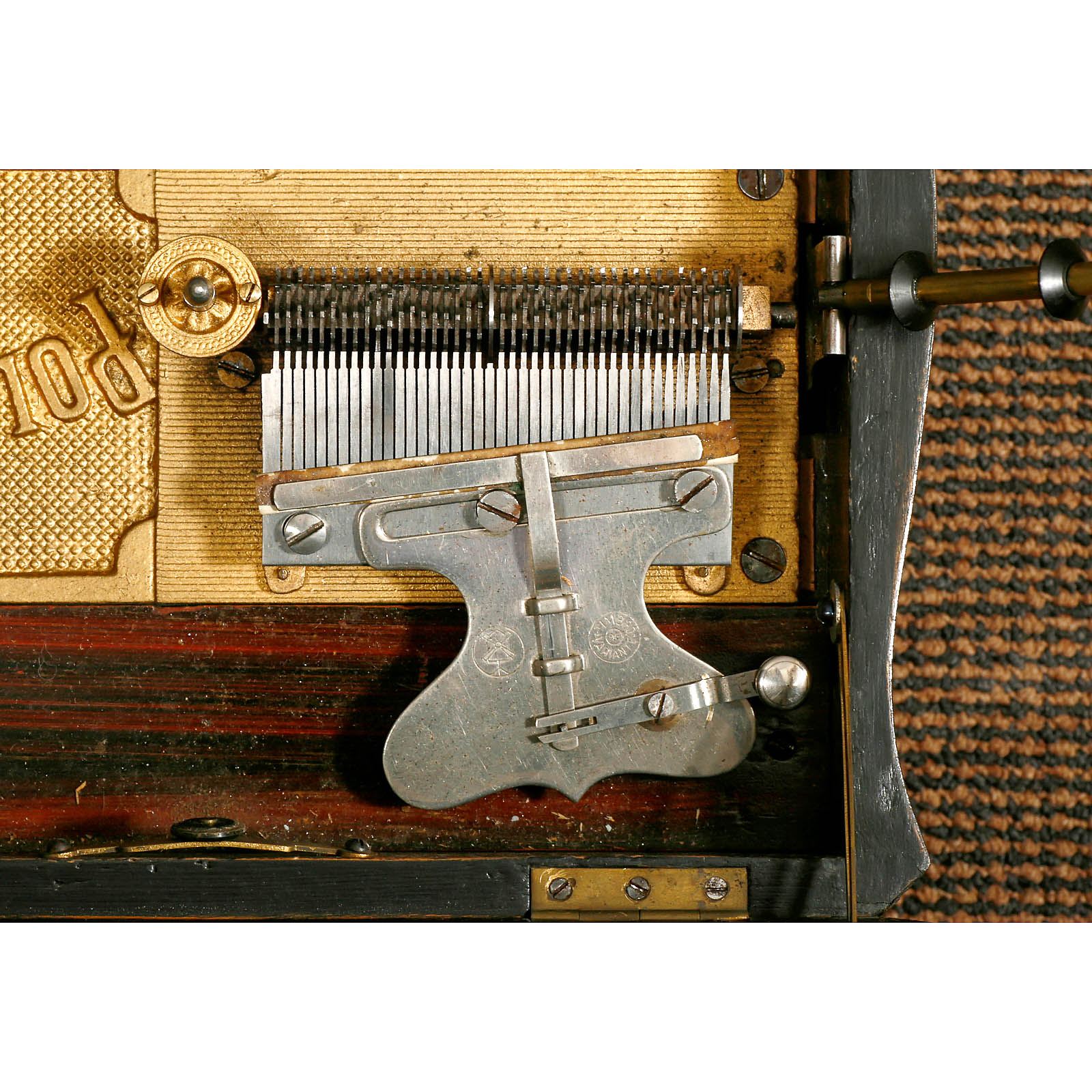 For 8 ¼ in. discs, 41 teeth in comb (complete), optional zither attachment, lever-wound spring motor, serpentine-shaped case, working, with 2 discs.
