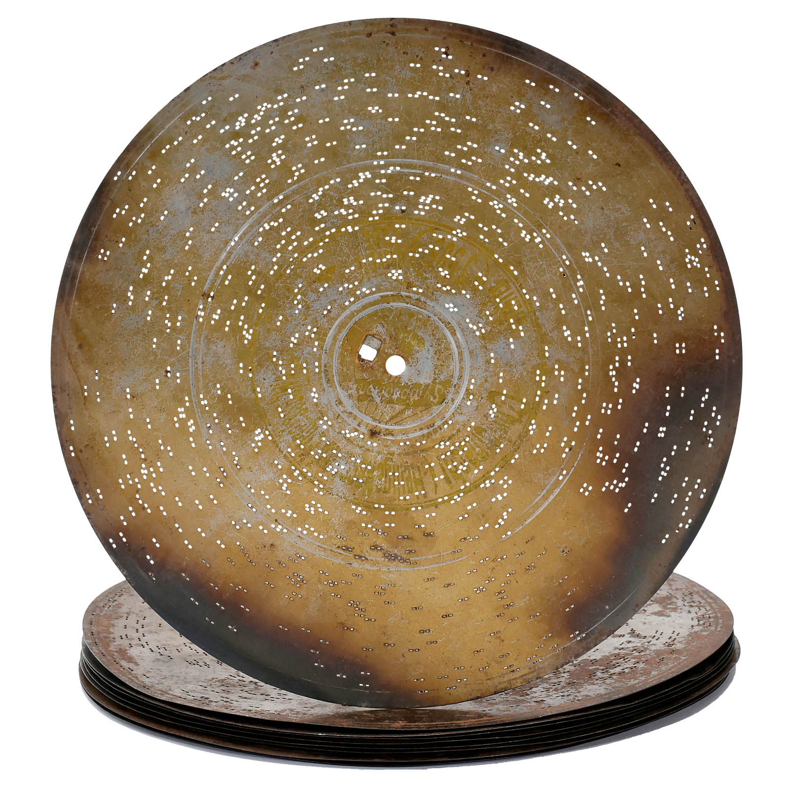11 ¾ in. disc musical box by Symphonion. Walnut cabinet with brass handles, 84 teeth in double comb (complete!). With 10 discs. Good playing condition!